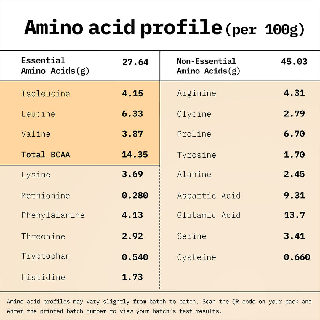 Contains all 9 essential amino acids. No amino spiking agents added