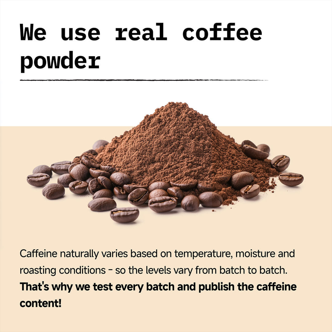 120 mg of caffeine per scoop from coffee powder (this varies batch to batch)