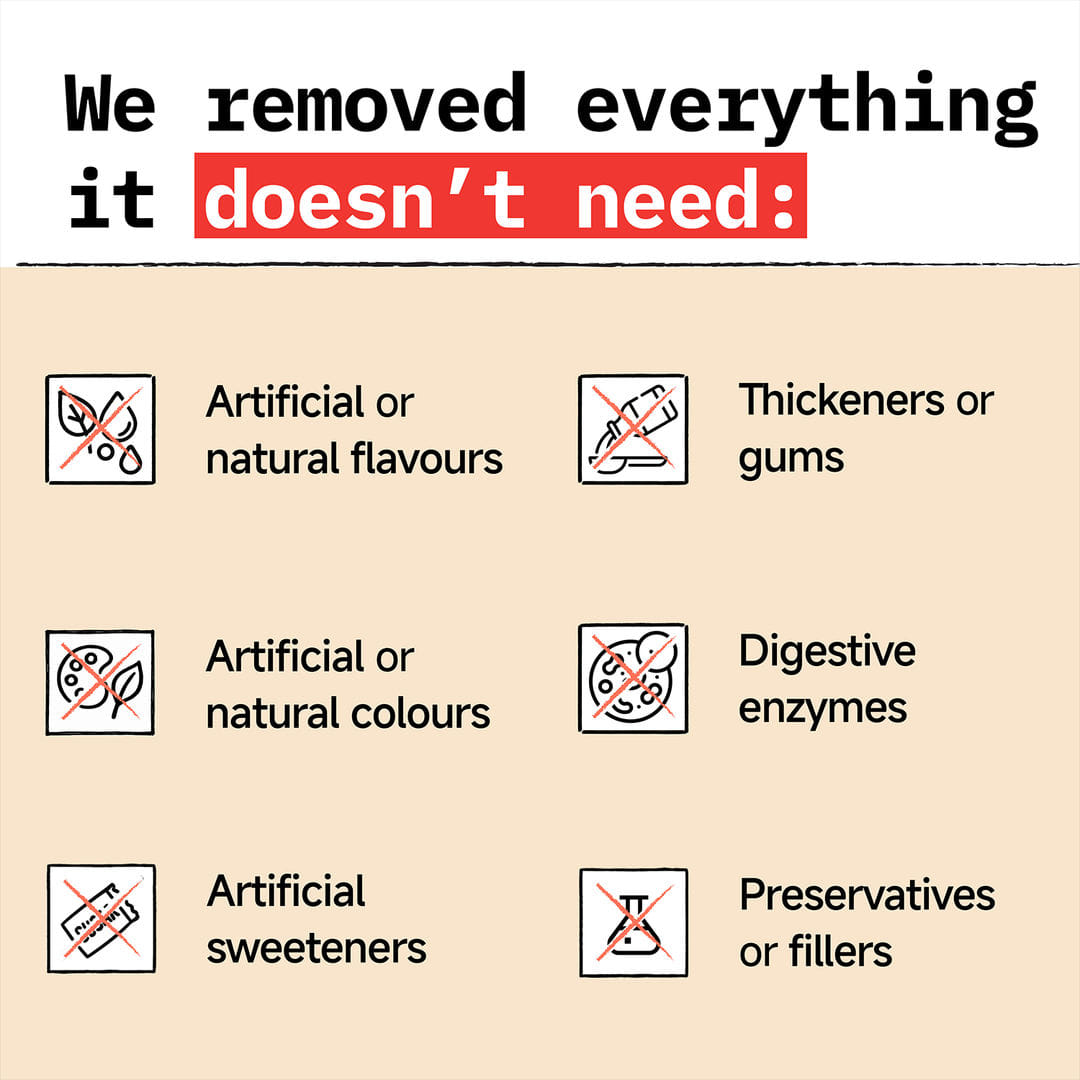 No artificial or natural flavours, no artificial sweeteners, no preservatives, no colours, no digestive enzymes or any other fillers