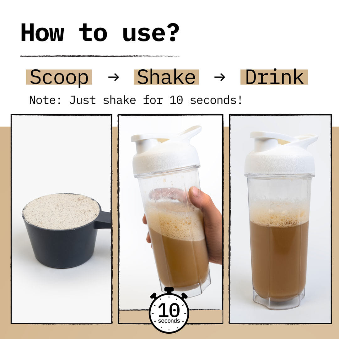 For smooth coffee-like feel: Add 200ml cold water/milk & shake for 10 seconds only
