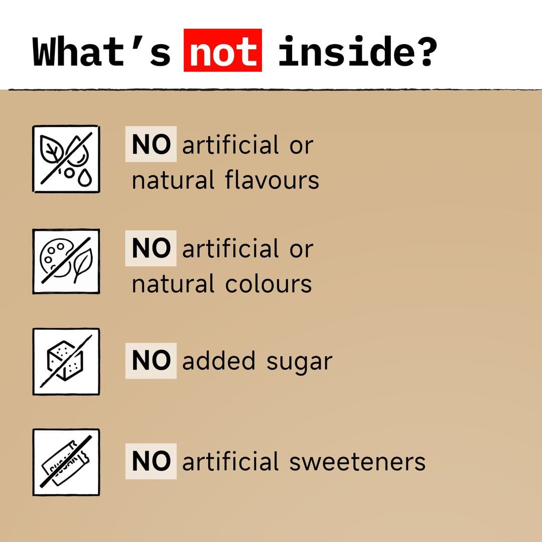 No artificial or natural flavours, no artificial sweeteners, no anti foaming agents, no colours, or any other fillers